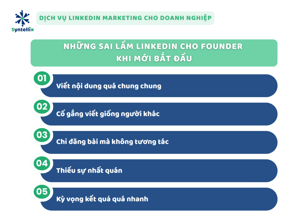 Xây dựng LinkedIn cá nhân là một quá trình dài hạn đối với founder. Tuy nhiên, nhiều người khi mới bắt đầu thường mắc phải những sai lầm LinkedIn cho founder như xem LinkedIn là kênh quảng cáo, viết nội dung quá chung chung, cố gắng bắt chước phong cách của người khác hoặc thiếu sự nhất quán trong việc chia sẻ nội dung.